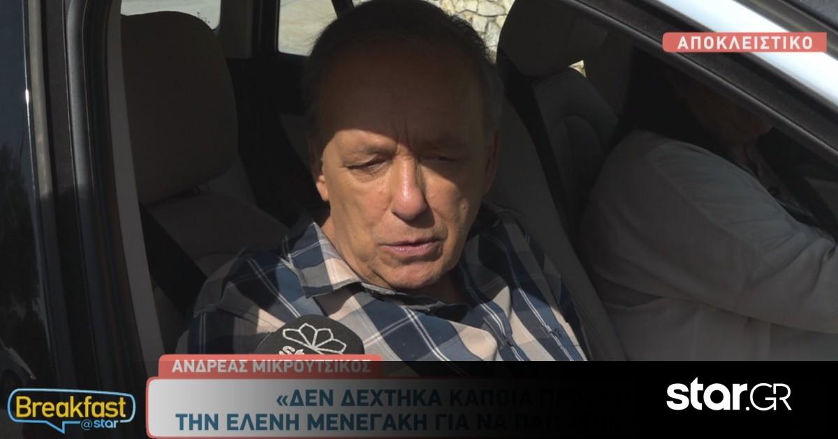 Η ρεπόρτερ του Breakfast@Star, Σοφία Μανουσακίδου, συνάντησε τον Ανδρέα Μικρούτσικο και τον ρώτησε αν προτίθεται να πάει στην Ελένη. «Μα δε δέχτηκα κάποια πρόταση επίσημη από την Ελένη Μενεγάκη… ας με πάρουν και θα δούμε», απάντησε αρχικά. «Απάντησα χιουμοριστικά ότι θα πάω όποτε γουστάρω εγώ για να δω τον Ουγγαρέζο, από ό,τι βλέπω ο χώρος το πήρε σοβαρά, θέλει ντε και καλά διενέξεις. Δεν υπάρχουν… για εμένα όταν γίνονται διενέξεις, συγκρούσεις, είναι από διαφορά απόψεων. Εδώ τι διάφορα απόψεων;», πρόσθεσε.