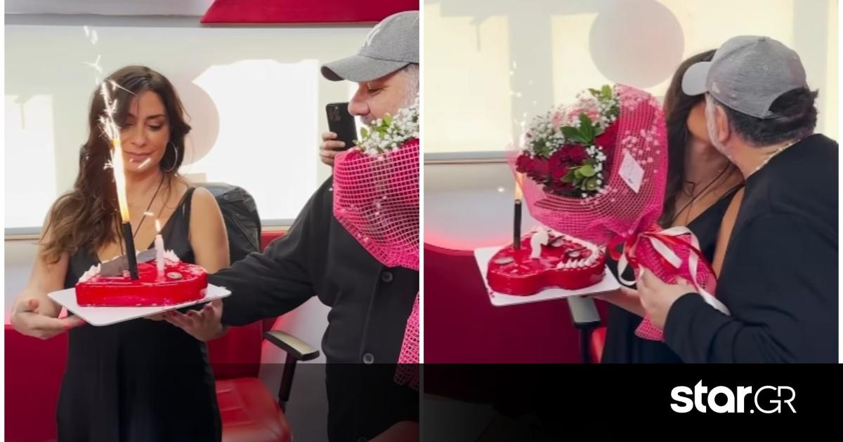 Κρατώντας μια κόκκινη τούρτα σε σχήμα καρδιάς και μια ανθοδέσμη, της τραγούδησε μαζί με τους συνεργάτες τους, το τραγούδι των γενεθλίων και της έδωσε ένα γλυκό φιλί.