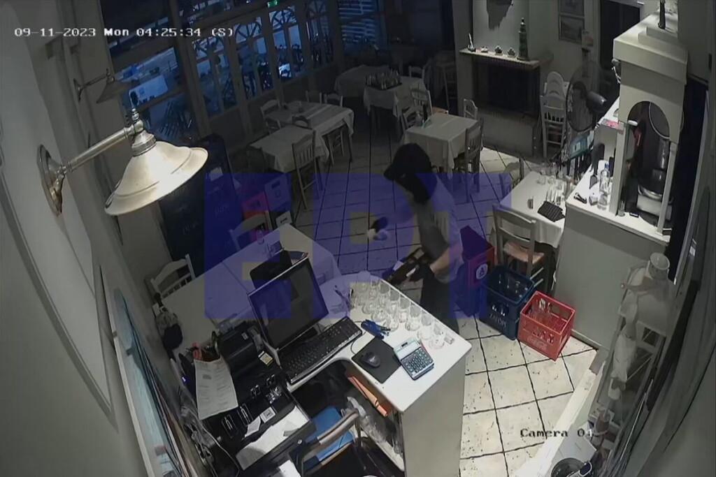 Ειδικότερα, σε βίντεο της ΕΡΤ απεικονίζεται η στιγμή που o 45χρονος είναι μέσα στο ψητοπωλείο και “ξηλώνει” το συρτάρι της ταμειακής μηχανής του καταστήματος που περιέχει χαρτονομίσματα και κέρματα.