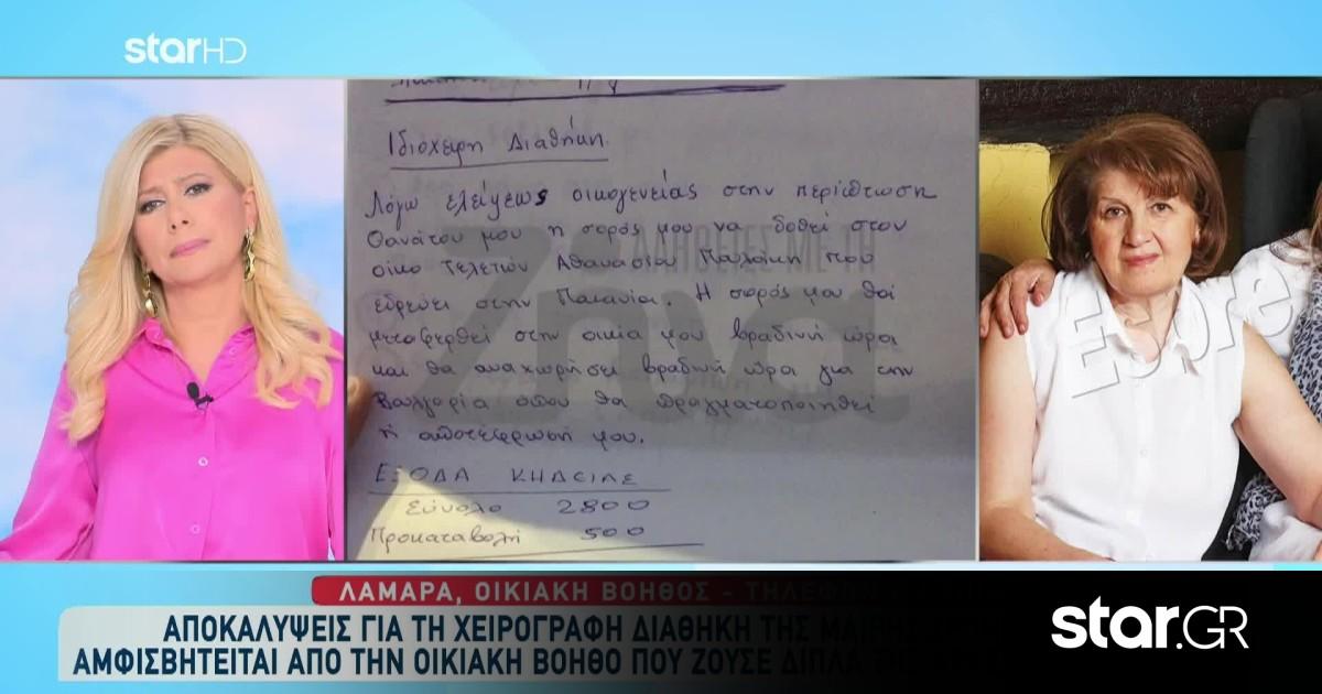 «Αυτός δεν είναι ο γραφικός χαρακτήρας της κυρίας Μαίρης. Δεν έγραφε με τόσο καλά γράμματα, γιατί είχε ωχρά κηλίδας. Δεν έβλεπε από το ένα μάτι και όταν ήθελε να βάλει μια υπογραφή, της κρατούσε εγώ το χαρτί. Δεν είναι τα γράμματα της κυρίας Μαίρης», είπε η Λαμάρα στις «Αλήθειες με τη Ζήνα» σχετικά με τις φωτογραφίες- ντοκουμέντα από την ιδιόχειρη διαθήκη.