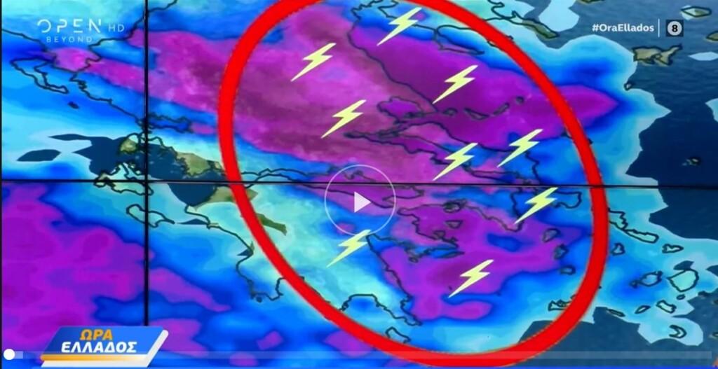 «Όλες οι περιοχές στον κόκκινο κύκλο μέχρι και τις πρώτες απογευματινές ώρες θέλουν ιδιαίτερη προσοχή γιατί τα χρώματα είναι πολύ σκούρα και σε ένα τρίωρο μπορεί να πέσει όγκος νερού ακόμη και 50 με 70 τόνους ανά στρέμμα», συμπλήρωσε.