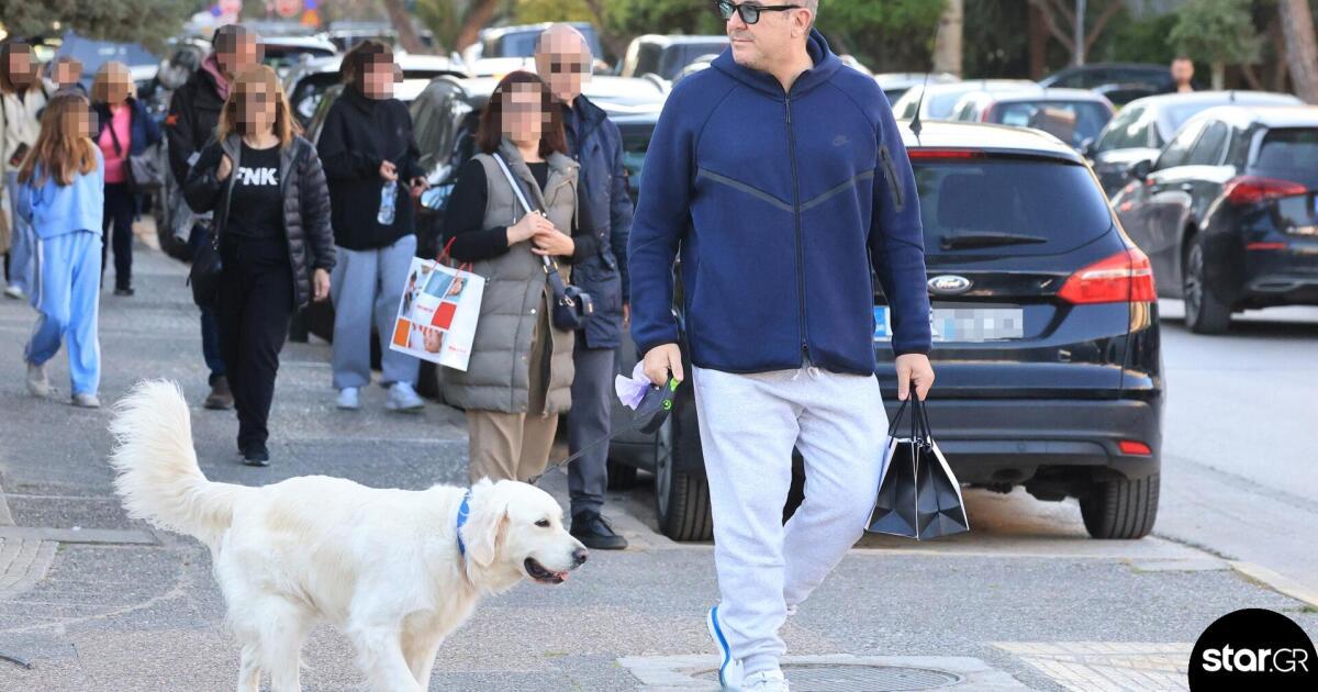 Ο λευκός retriever του έδειχνε ιδιαίτερα ήρεμος και χαρούμενος, ακολουθώντας πιστά τον ιδιοκτήτη του, με τους δυο τους να συνθέτουν μια εικόνα απλής καθημερινότητας, μακριά από τα φώτα της δημοσιότητας. Στο φόντο, περαστικοί κινούνται στον ίδιο δρόμο, ενισχύοντας το σκηνικό μιας συνηθισμένης βόλτας σε μια από τις πιο ζωντανές περιοχές των νοτίων προαστίων.
