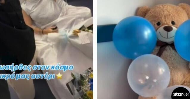 Το δωμάτιο όπου έφερε στον κόσμο το παιδί της είναι γεμάτο πολύχρωμα μπαλόνια και εντυπωσιακές ανθοδέσμες, δημιουργώντας ένα ζεστό και γιορτινό σκηνικό που αποτύπωνε τη χαρά και τη συγκίνηση της στιγμής.