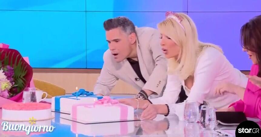 Οι συνεργάτες τους στην εκπομπή Buongiorno τούς επιφύλασσαν μια όμορφη έκπληξη στο πλατό. Ένα μπουκέτο λουλούδια κατέφτασε για την παρουσιάστρια, ενώ οι παρουσιαστές έσβησαν μία ροζ και μία μπλε τούρτα!
