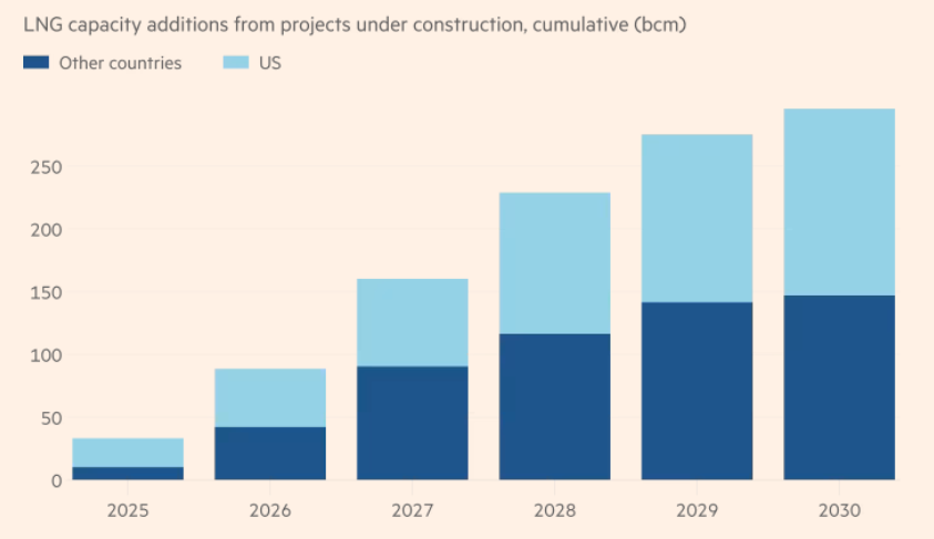 Η χωρητικότητα των υπό κατασκευή έργων LNG στις ΗΠΑ και τους υπόλοιπους εξαγωγείς. Πηγή: FT.