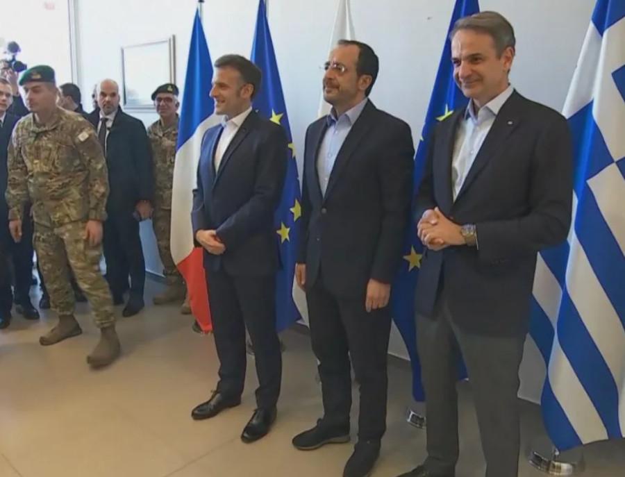 Λίγα λεπτά αργότερα έφτασε στην Πάφο και ο Γάλλος πρόεδρος Εμανουέλ Μακρόν, με τον Νίκο Χριστοδουλίδη να τον καλωσορίζει θερμά. Ο Έλληνας πρωθυπουργός, συνοδευόμενος από τον υπουργό Εξωτερικών Γιώργο Γεραπετρίτη, κατευθύνθηκε στον χώρο της τριμερούς συνάντησης, η οποία αναμένεται να καταλήξει σε κοινές δηλώσεις και επιθεώρηση των αεροσκαφών F-16 που βρίσκονται στην αεροπορική βάση της Πάφου.