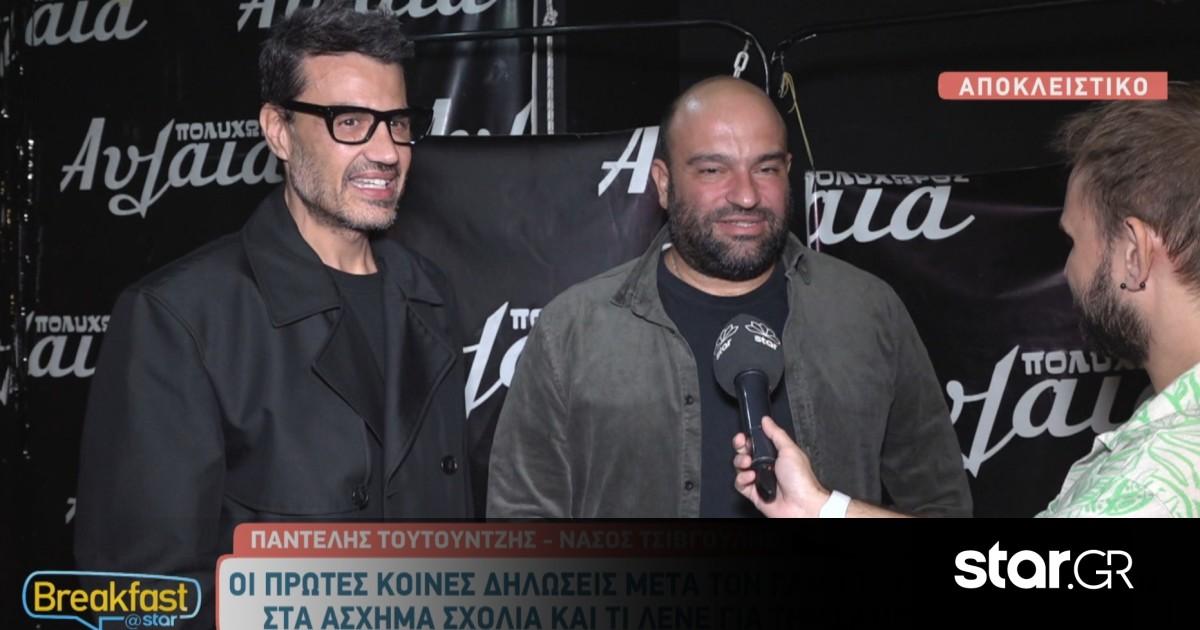 Την πρώτη τους κοινή συνέντευξη μετά το γάμο τους έδωσαν οι Παντελής Τουτουντζής και Νάσος Τσιβγούλης στο Breakfast@Star και τον Πάνο Παπαδόπουλο. Οι δυο τους μίλησαν για το πώς βίωσαν την τελετή, για την Ελένη Φουρέιρα, την ελληνική κοινωνία, αλλά και τον Μάρκο Σεφερλή και τη σάτιρα.