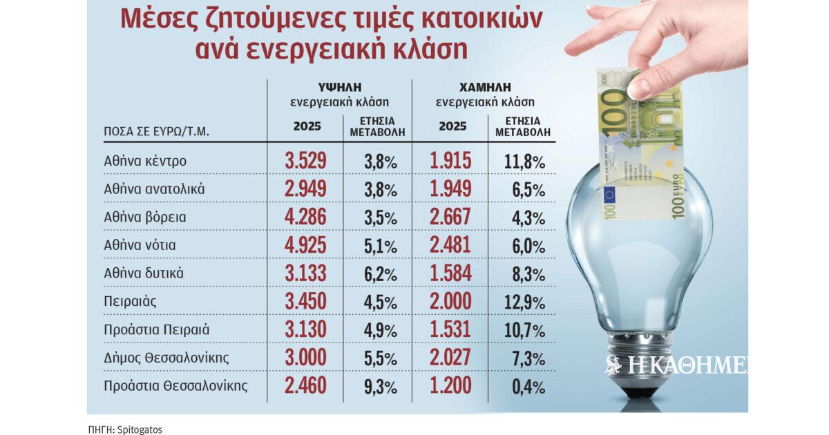 Με ταχύτερο ρυθμό αυξήθηκαν το 2025 οι ζητούμενες τιμές πώλησης των κατοικιών που τοποθετούνται στις δύο χαμηλότερες κατηγορίες του ενεργειακού πιστοποιητικού, δηλαδή προσφέρουν πολύ χαμηλή ενεργειακή απόδοση, συγκριτικά με τα ακίνητα που θεωρούνται «πράσινα» (κατηγορίες από Α+ έως και Β). Το συμπέρασμα αυτό προκύπτει με βάση σχετική ανάλυση που πραγματοποίησε η πλατφόρμα αγγελιών Spitogatos.gr και καταδεικνύει τη στροφή της ζήτησης προς πιο προσιτές λύσεις και επιλογές, ακόμα κι αν αυτό σημαίνει ότι το ακίνητο δεν διαθέτει μόνωση και άλλες παροχές που συνοδεύουν τα ακίνητα υψηλής ενεργειακής απόδοσης (π.χ., αντλία θερμότητας κ.λπ.).